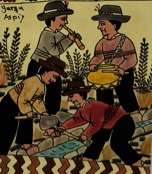 El proceso de aprendizaje dentro de ADAPS fue natural. Desde pequeña, se involucró en la preparación de las tablas, desde el empastado de la madera hasta los detalles finales de los personajes. Su primer contacto con la pintura surgió de manera lúdica: "Cuando tenía cuatro años, encontré tierras de colores en latas y, con arena bien seca y dura, hacía esculturas. Luego, humedecía las tierras y pintaba mis esculturas". Esta exploración infantil pronto se transformó en una práctica artística consciente, enraizada en la memoria y la comunidad.